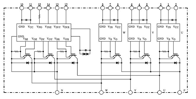 MIG20J103H absolute maximum ratings: (1)Supply Voltage, VCC: 400V; (2)Collector-Emitter Voltage, VCES: 600V; (3)Collector Current (DC), ±IC: 20A; (4)Collector Power Dissipation, PC: 62W; (5)Junction Temperature, Tj: 150℃; (6)Supply Voltage, VD: 20V; (7)Intput Voltage, VlN: 20V; (8)Foul Output Voltage, Vfo: 20V; (9)Foul Output Current, IfO: 7mA; (10)Operating Temperature, Tc: -20℃ to +100℃; (11)Storage Temperature Range, Tstg: -40℃ to +125℃; (12)Isolation Voltage, VISO: 2500Vrms; (13)Screw Torque: 2N.m.